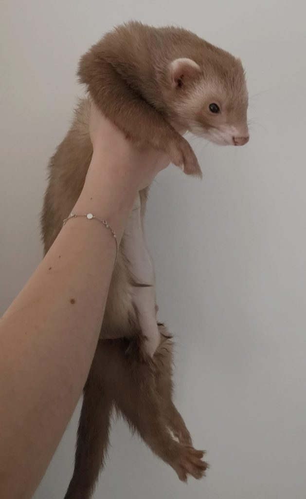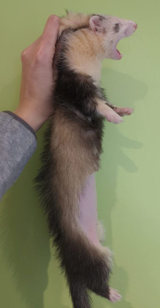 Si vous désirez réaliser une contention légère, vous placez une main sous les aisselles de votre furet (les pattes pendent dans le vide).