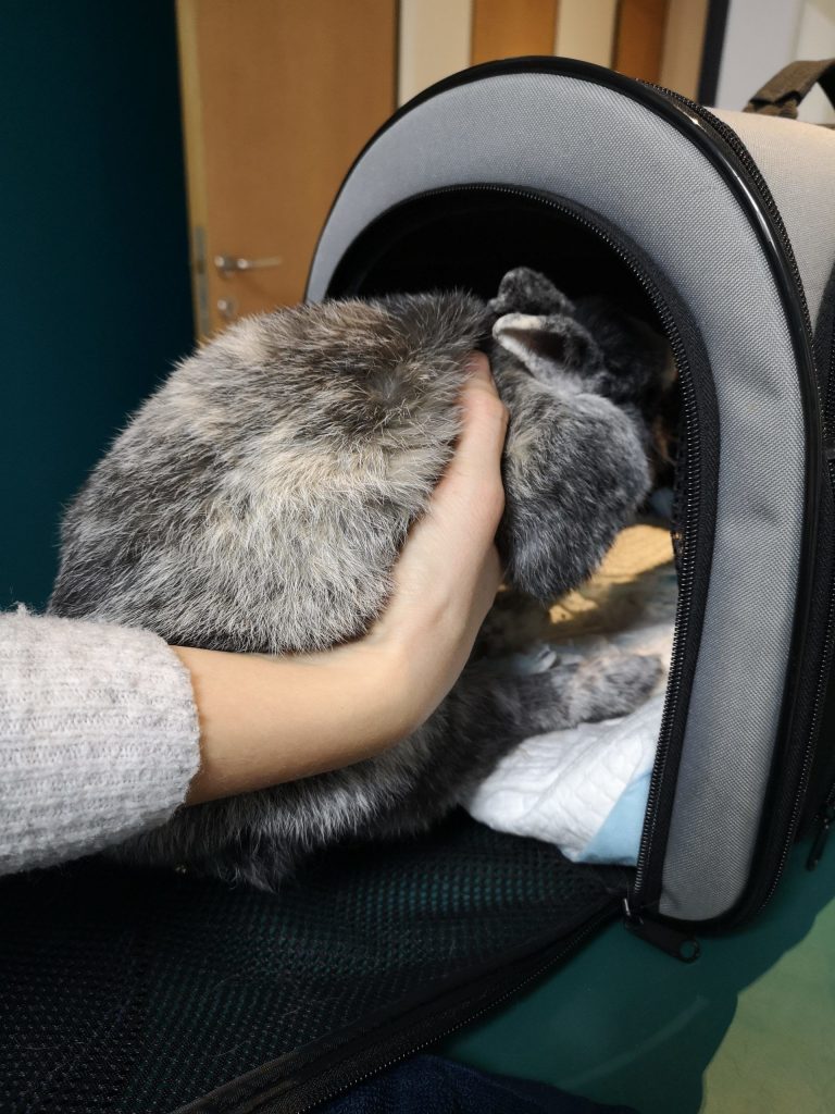 - Pour sortir votre lapin de son enclos ou de sa boite de transport en toute sécurité : Le lapin est sorti par l’arrière-train, en plaçant une mais sous le thorax et l’autre, derrière les pattes arrière. Pour le maintenir dans vos bras, placez le lapin contre vous, la tête cachée dans votre coude, avec une main derrière les lombaires.